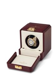 cassa in oro giallo 18kt con movimento a vista, quadrante a due colori con lavorazione guilloche centrale e disco delle ore del giorno e della notte, movimento a carica automatica ref. 240HU con micro rotore in oro 18kt, cinturino originale in pelle e fibbia deployant in oro giallo giallo 18kt originali. Corredato di scatola originale con rotore. Diam. mm 37