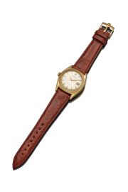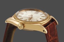 cassa oyster in oro giallo 18kt, quadrante argentè a scalino con indici applicati, grafica colore nero, fondello a vite, ghiera zigrinata oro, rara corona di carica a sinistra marcata Super Rolex Oyster, movimento a carica automatica ref. 1065, cinturino in pelle con fibbia placcata oro, vetro plastica. Diam. mm 36