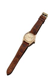cassa oyster in oro rosa 18kt, quadrante champagne con indici applicati, grafica nera, disco data in inglese, ghiera zigrinata oro, fondello a vite, movimento a carica automatica, cinturino in pelle, vetro plastica. Diam. mm 36