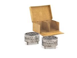 di forma ovale in argento traforato, interno in vetro, complete di scatola, cm 7,5x5,5, g 100 (2)