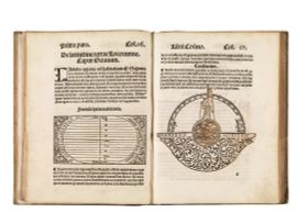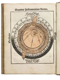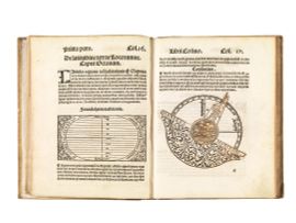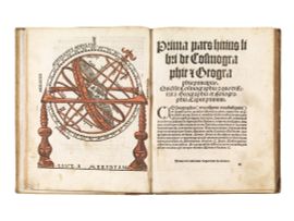 EXTREMELY RARE FIRST EDITION of one of the most popular cosmography books ever published, profusely illustrated with xylographs depicting globes, scientific instruments, maps and astronomical and geographical diagrams. This copy has only two perfect and functioning volvelles, but it is complete with the unused volvelles applied to the back of the final paper, often lacking. America is depicted on the globe on fol. 2 and described on fol. 69.