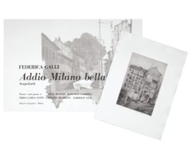 N. 49 di sole 99 copie (più XX fuori commercio). Splendida cartella dedicata a Milano, con cinque grandi incisioni, TUTTE FIRMATE in calce dalla Galli e datate 1971, che raffigurano via Argelati e altri pittoreschi scorci di una Milano scomparsa. I testi che accompagnano le grafiche sono il racconto “I ricordi” di Dino Buzzati, la poesia “Porta Venezia a Milano” di Raffaele Carrieri, il racconto “Il gioco delle bocce” di Piero Gadda Conti, la poesia “Veduta di Milano dal Nautilus” di Giuliano Gramigna, e infine il racconto “Corso Garibaldi le sorelle dei fiori” di Alberico Sala. Le acqueforti sono state stampate con torchio a mano dai calcografi della Litografica Internazionale di Milano. Bellissima carta Fabriano. Frontespizio su due pagine. Federica Galli (1932-2009) è stata un’artista italiana, attiva soprattutto nell’incisione all’acquaforte. Sono famose le sue incisioni di alberi.