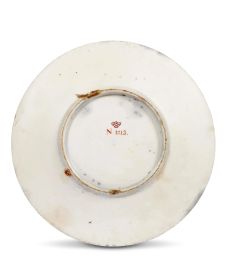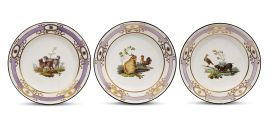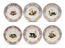 in porcellana decorata in lillà, policromia e oro. I sei piatti da coltello fanno parte di un noto servizio denominato in manifattura “servizio con animali e fascia lillà”, denominazione presente negli inventari compilati nel 1807, poco prima della cessione della manifattura alla società francese Poulard-Prad. Si tratta di una delle ultime produzioni della manifattura napoletana per la tavola di Ferdinando IV, probabilmente destinata alle feste di caccia del Palazzo di Portici. Già in un documento del 1783 si parlava di un servizio denominato “Stato di caccia”, destinato alla tavola dell’Imperatore d’Austria eseguito dai migliori artefici della manifattura e ideato da Giacomo Milani. Il confronto più prossimo ci deriva da alcuni pezzi del servizio conservati al Museo civico di Torino, da cui abbiamo un preciso riferimento alla fonte del testo Tetes des differents animaux di Guillaume Tischbein edito nel 1796, come conferma della ispirazione da parte di Milani e collaboratori a precise fonti incisorie. In alcuni piatti dell’assortimento presente al Museo di Capodimonte si rileva invece una differente fonte di ispirazione, tanto da far pensare ad una copia degli animali dal vero in occasione della produzione del già citato servizio di caccia. Più semplici poi gli animali eseguiti nel periodo produttivo Poulard-Prad, e ancora differente la serie Del Vecchio su terraglia. L’eterogeneità del servizio conservato a Napoli è dovuta al protrarsi nel tempo dell’utilizzo dello stesso: è assodato che il servizio nella sede di Portici doveva contare circa seicentocinquanta pezzi, oggi ridotti a novantuno esemplari. Anche nell’assortimento in esame si riscontrano alcune differenze di materia e stile: un piatto reca il numero 1813 sormontato da corona, uno la scritta in corsivo amman. I tre piatti più grandi mostrano scenette con più animali, caratterizzati da uno stile più attento ed incisivo, differente da quello che rileviamo nei tre piatti con singoli animali più morbidi nel tratto e nell’esecuzione, ad ulteriore conferma delle differenti fasi esecutive dell’imponente servizio ferdinandeo; diam. cm 24 e 24,2