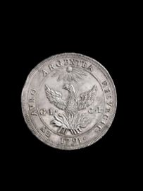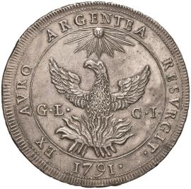 Ag gr. 68,31 D/ FERDINANDVS D G SICIL ET HIER REX Busto corazzato a d. con drappeggio sulla spalla s. R/ EX AVRO ARGENTEA RESVRGIT La Fenicia ad ali spiegate, sul rogo, illuminata dal sole; ai lati, G L - C I (Gabriele Lancillotto Castello principe di Torremuzza zecchiere) e sotto, nel giro, 1791 Taglio: gigli in rilievo Spahr 2 MIR 597
