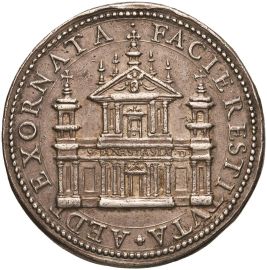 Ag mm. 42,35 D/ VRBANVS VIII PON MAX A XIII Busto a d. a capo scoperto con piviale; sul taglio della spalla GASP MOLI R/ AEDE EXORNATA FACIE RESTITVITA Prospetto della facciata di S. Anastasia sul cui frontone, S ANASTASIA D Bartolotti 636 var. Lincoln 1019