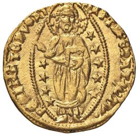 D/ FRAC FOSCARI S. Marco porge il vessillo al Doge genuflesso R/ Il Redentore, circondato da stelle, entro aureola ellittica Au gr. 3,55 Mont. 158