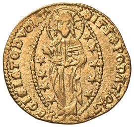 D/ LAVR CELSI S. Marco porge il vessillo al Doge genuflesso R/ Il Redentore, circondato da stelle, entro aureola ellittica Au gr. 3,55 Mont. 115