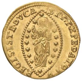 D/ M ANT IVSTIN S. Marco porge il vessillo al Doge genuflesso R/ Il Redentore, circondato da stelle, entro aureola ellittica Au gr. 3,51 Mont. 2063