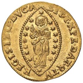 D/ SILV VALERIO S. Marco porge il vessillo al Doge genuflesso R/ Il Redentore, circondato da stelle, entro aureola ellittica Au gr. 3,45 Mont. 2168