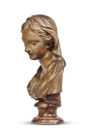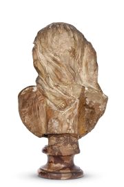 in terracotta raffigurante figura femminile velata, alt. cm 42; su piedistallo modanato in marmo, alt. cm 11