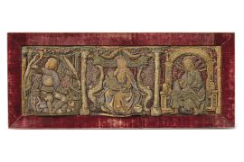 in stoffa ricamata con filo d'oro e argento a raffigurare al centro la Madonna con Bambino affiancata da San Michele Arcangelo e da evangelista, assisi in trono entro edicole, cm 35x104