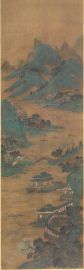 su carta raffigurante saggio su animale con figura femminile e paesaggio montano in verticale; cm 140x38 e cm 109x33 (2)