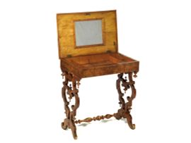 in legno lastronato con filettature in legno più scuro, piano apribile a mostrare specchio e sei scomparti, di cui uno più grande centrale, gambe intagliate a giorno a motivi di volute riunite da traversa a rocchetto, cm 75x68x45