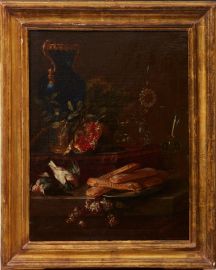 "Questa natura morta con dei biscotti, una melagrana, dei fiori, dei vetri preziosi e degli uccellini morti (olio su tela, m. 0,55x0,505) va riferita a Giovanni Paolo Spadino (Roma 1650 c.-1740) sulla scia di Christian Berentz e in stretta contiguità con Cristoforo Munari nato dalla stessa matrice e operante accanto a lui sia a Roma che a Firenze. Al Munari, infatti, si penserebbe alla prima per le luci che toccano i vetri e per la cura e per la cura con la quale sono resi i biscotti, ma il cromatismo caldo e il fervore rilevabile sulla melagrana spaccata, nei fiori e negli uccellini morti portano decisamente verso lo Spadino. Basta, per convincersene, il confronto con la natura morta, firmata a tutte lettere (già nella collezione Nigro di Genova) illustrata da Giuseppe De Logu in "Natura morta italiana" (Bergamo 1962, Tav. 57) utile anche perché permette di stabilire un confronto tra gli stessi elementi della composizione.