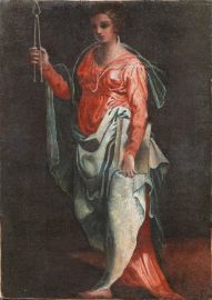 Le due sante che si stagliano su un fondo scuro attraverso una libera pennellata che fa brillare i profili delle pieghe delle vesti di iridescenze colorate sono state ricondotte con certezza da Mario Bucci (lettera manoscritta al proprietario) alla mano di Giovanni Battista Naldini (Fiesole, 1537 – Firenze, 1591), aiuto di Pontormo e collaboratore di Giorgio Vasari all’interno di molti cantieri decorativi.