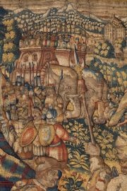 raffigurante l'accampamento di Annibale; tra le tende dell'accampamento, posto in un ambiente boschivo e riccamente popolato di personaggi con una città assediata sullo sfondo, si trova il re in trono, colto nell’atto di farsi curare una ferita da un medico. Completo di bordura probabilmente ottocentesca, decorata da un nastro con elementi fogliacei ricorrenti, cm 216x366