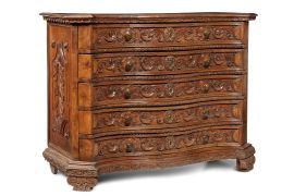 in noce, piano di forma sagomata con angoli scantonati sul fronte, bordo a becco di civetta sotteso da fascia intagliata a fruttini, cinque cassetti di linea mossa con bocchette e maniglie inquadrate da cartelle sagomate tra volute intagliate a strigliature e intervallati da sottili cornici a campanule ricorrenti che dai centri, segnati da nodi, si portano verso i lati, bocchette in bronzo foggiate a cartiglio, fianchi ornati da sformellatura mistilinea scolpita con grande elemento fogliaceo, base modanata intagliata a motivi fogliacei su piedi a mensola ornati a elementi vegetali, cm 118x152x64