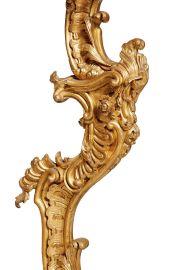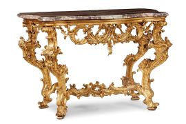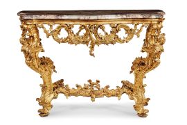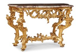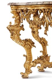 in legno intagliato e dorato con piano di forma sagomata lastronato in marmo fior di pesco; grembiale riccamente scolpito a giorno a motivo di volute impreziosite da fiori e foglie convergenti al centro a trattenere un elemento fogliaceo, mentre i lati sono ornati da un rametto vegetale, gambe di linea mossa riccamente scolpite in foggia di molteplici volute impreziosite da foglie che dall’alto si portano verso il basso per terminare su piedini a foglia, riunite da traverse formate da un incrocio di volute spezzate riunite al centro in un motivo a cartouche, cm 92x135x68