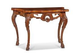 in noce e radica, piano di forma sagomato profilato da riserva a inquadrare la radica, gambe mosse intagliate a volute e motivi vegetali stilizzati poggianti su piedi a zoccolo equino anch’esso stilizzato, grembiale a giorno sagomato su tre lati con ampio decoro rocaille al centro a raffigurare conchiglia, cm 80x119x68