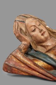 Nel campo della scultura lignea rimangono solo alcuni rari, importanti esemplari, come quello databile tra il 1325 e il 1335 proveniente dal complesso monastico di Santa Chiara a Napoli, oggi nelle Gallerie di Capodimonte (già Museo della Certosa di San Martino), realizzata da un ignoto maestro nel quale la critica ha colto riferimenti alle sculture orvietane del senese Lorenzo Maitani coniugate ad una finezza decorativa di matrice francese (G. Curzi, Op. cit.; F. Bologna, R. Causa, Sculture lignee della Campania, Napoli 1950, pp. 89-90, n. 31). Altre opere analoghe si conservano in provincia dell’Aquila nella chiesa di Santa Maria Assunta di Assergi (XIV secolo) e in quella di Tossicia (inizio XV secolo) (G. Curzi, Op. cit.), presso le collezioni di scultura di Palazzo Venezia (opera castigliana dei primi anni del XV secolo) mentre la versione più significativa, attribuibile all’anonimo Maestro di Fossa con una datazione al 1340, si trova a Tolentino nel Museo della Basilica di San Nicola (E. Neri Lusanna, Il gruppo ligneo della natività di San Nicola a Tolentino e la scultura marchigiana, in Arte e spiritualità negli ordini mendicanti. Gli Agostiniani e il Cappellone di San Nicola a Tolentino, atti del Convegno di Tolentino, 1990, Roma 1992, pp. 105-124, in part. p. 107). Quest’ultimo è particolarmente rilevante perché dimostra come anche la nostra scultura in origine avrebbe potuto comporre insieme ad altre figure, sicuramente il San Giuseppe e il Gesùavvolto in fasce ai piedi del giaciglio della Vergine, una suggestiva scenografia sacra destinata alla cappella di una congregazione religiosa o di un oratorio dove si celebravano cerimonie o festività dedicate alla Madonna del parto o a devozioni affini.