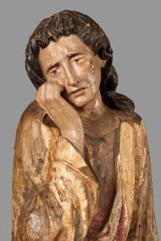 Le analogie tra il nostro San Giovanni e quello del Compianto di Ripalta Vecchia pur molto marcate si risolvono essenzialmente in derivazioni di ordine compositivo ed espressivo, sintomo di come in quegli stessi anni l’interazione tra le botteghe di sculture attive in area lombarda e le maestranze piemontesi siano davvero molto intense. Con gli altri due gruppi invece salvo le peculiari varianti compositive e stilistiche registrabili in ciascun gruppo, le nostre due figure condividono una medesima cronologia sulla metà del secolo, la predilezione per anatomie molto allungate ed esili che si perdono sotto le schiacciate volute delle vesti dai panneggi ampi, ma di contenuto risalto volumetrico e dal pesante appiombo che si risolve cadendo in pieghe angolari e accartocciate. Analogamente le mani, possenti e squadrate, si articolano in gestualità schematiche, mentre i tratti dei volti risultano essenziali e segnati dalla patetica apertura delle bocche o dalla potente sagomatura delle tese arcate sopraccigliari.