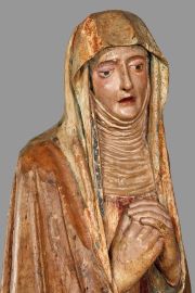 La coppia di Dolenti, di dimensioni superiori al naturale e di elevato impatto emotivo, dovevano in origine affiancare l’immagine del Cristo crocifisso in un complesso scenografico raffigurante il Calvario destinato alla venerazione dei fedeli sul vertice del tramezzo di un importante edificio di culto. Le due sculture trovano delle stringenti concordanze iconografiche con il gruppo di medesimo soggetto della chiesa di Santa Maria di Castello ad Alessandria, assegnato da Raffale Casciaro alla mano di Urbanino da Surso, scultore lombardo con una fitta parentesi operativa anche nel basso Piemonte. I due Dolenti alessandrini presentano infatti posture e atteggiamenti degli arti del tutto analoghi alle nostre figure comparendo, per giunta, sopra ad un basamento intagliato a emulazione di uno sprone roccioso, in grado di evocare la scenografia della loro originaria destinazione (R. Casciaro, La scultura lignea lombarda del Rinascimento, Milano 2000, pp. 248-249, n. 9).