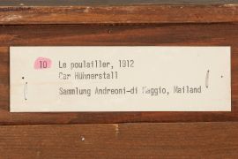 Between 1903 and 1908, Francis Picabia produced a considerable number of Impressionist paintings in the tradition of Pissarro as well as neo-Impressionist works, exhibiting at an individual show at the Galerie Haussmann in 1905 and at the Galeries Georges Petit in 1909. Beginning in 1908, his desire to follow new paths had been leading him to abandon his earlier techniques. As far as his colours went, he accentuated the Fauvist components of his language as he explored the emotive and expressive values of colour. And, combining the intensity of the colour with the Cubists’ multiplication of planes and faceting, reciprocally contaminated the two visual systems in his work. With its interpenetrating areas in shades of ochre and browns – almost as though in an intarsia – Le poulailler represents an exercise with a dual scope: first, to break apart a known figure, a barnyard animal, as a child would paint it, into a multiplied set of waves and half moons, squared-off areas reduced to pieces fitting one into the next, sparking interaction of the geometric and faunal form, to again multiply a differentiated arabesque of movements; and secondly, to study the alternate valences of saturated and compact hues and of geometric and casual flecking, scattered everywhere, in a play of abstract dots with a flair for decorative, almost “optical” vibration. Le poulailler was presented at a show at the Galleria Schwartz of Milan in 1974, as a never-before-seen work by Francis Picabia, accompanied by a presentation by William A. Camfield, curator in 1970 of a fundamental U.S. exhibition of Picabia’s works (W. A. Camfield, Francis Picabia, catalogue of the exhibition: New York, Solomon R. Guggenheim Museum; Cincinnati, Art Museum; Toronto, Art Gallery of Ontario; Detroit Institute of Arts, 1970). Camfield, although revealing that in 1912 Picabia was actually contemplating starting a chicken farm, stressed the eminently pictorial and not at all anecdotal character of the painting and acknowledged its appealing visual immediacy. He wrote, «one is absorbed by agreeable visual experiences of form, colour, texture and composition». He placed the painting in a well-defined moment of Picabia’s artistic career: that immediately following his Fauvist experimentation, when recourse to his own highly personal interpretation of the multiplication of planes in the Cubist spatial structure led him to combine the two formal systems, Fauvism and Cubism, with a strong leaning toward abstraction. Camfield also noted that the hens are treated very abstractly; their identity yields before a set of planes of harmonious colour in which sonorous shades of blacks, whites, browns, russets and greys are artfully distributed to create contrasts and are accented by the red of the combs and wattles, rendered in “succulent” colour laid on in heavy brushstrokes to underline the essentially visual qualities of the painting and its autonomous status as a painting per se and not a painting of something. The canvas shows some affinities, in terms of the formal solutions adapted by the artist, with Landscape, La Creuse (Paysage de la Creuse), dated by Camfield to 1912 (W. A. Camfield, Francis Picabia (exhibition catalogue). New York, The Solomon R. Guggenheim Museum, 1970, no. 21, p. 65). In this landscape, the trees and the hills are treated as flat shapes made to stand out on the ground planes by darker outlines; their forms are similar to rounded cut-outs, and the search for a way to fit the different parts together recalls the interlocks of the flat shapes of the hens in Le poulailler.