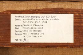 on the reverse: on the stretcher label of the Collezione Andreoni-di Maggio of Milan, label of the Galleria Schwarz in Milan, label of the exhibition Picabia, Maquines i Espanyoles, label of the exhibition Francis Picabia in Zürich, label of the exhibition Francis Picabia in Valencia