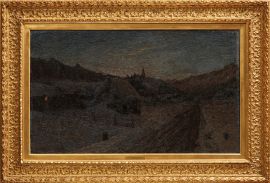 Giovanni Segantini was born in 1858 at Arco, a village in the Trentino region overlooking the north end of Lake Garda. Quite early in his life, dramatic family events forced him to move away from his home to never return. However, the love of the mountains was so deeply rooted as to prompt him to leave the comforts of city life and live in the Lombard and Swiss mountains. A difficult man, who was practically illiterate at the start of his artistic career, an evader of rules and taxes, he found peace and fulfilment in painting, in his love for Luigia (Bice) Bugatti his lifelong companion and their children. Many different places offered fascinating inspirations for the development of his art: from Pusiano and the lake he immortalized in Ave Maria a trasbordo, to Caglio amidst the Valsassina hills – the setting for Alla stanga (Rome, Galleria Nazionale d’Arte Moderna). Ultimately he arrived at Savognin, in the Canton of Grisons where he would remain until 1894 when he moved to Maloja in the Upper Engadine. At Savognin he painted the village with the church and bell tower surrounded by low, sturdy mountain dwellings. The details of the snowy blanket, its consistency and the light it emanates are the subject of several pictures such as the famous Savognino d’inverno (c. 1890) or Ritorno dal bosco from the same year (St. Moritz, Segantini Museum). The painting that Annie-Paule Quinsac, the leading expert on Segantini, had authenticated, is datable to c. 1888. She recently reported that it could be the painting listed as Tramonto in alta Engadina, listed in the section of the catalogue raisonné dedicated to unidentified works (A.-P. Quinsac, Segantini. Catalogo generale, Electa, Milano 1982, II vol., p. 544, S 12). In that catalogue entry, Ms. Quinsac referred to an undated letter Segantini wrote to Princess Bibesco that reads: «Most noble princess. The day before yesterday I sent you the drawing, Il Tramonto del Sole sull’Engadina, in a new mount that I had made in Milan, with the appropriate margins. It will look well in a simple frame gilded in light gold» (Segantini, Trent’anni di vita artistica europea nei carteggi inediti dell’artista e dei suoi mecenati, ed. by A.-P. Quinsac, Cattaneo Editore, Oggiono 1985, pp. 728-729, n. 877). The drawing is also mentioned in another letter, one he wrote to Alberto Grubicy and dated 13 January 1899 (n. 719). The date, a decade after he had finished the painting, should not be cause for surprise since Segantini frequently made drawings on paper of previously completed paintings. It is very likely that, as Ms. Quinsac had reported in the statement in the 1984 catalogue entry written by Giuseppe Luigi Marini, the place can be identified as Savognin: «The snowy landscape corresponds to a painting I know from the artist’s correspondence and was unable to locate in nearly 15 years of research. It is an important painting from the artist’s mature years; it should be dated around 1888, [his] years of technical experiments after he had adopted divisionism. It depicts the village of Savognin at night and covered with snow» (G.L. Marini, 29 documenti pittorici del secondo Ottocento e del primo Novecento, Cuneo 1984).