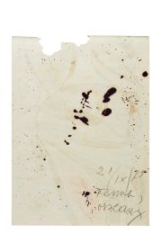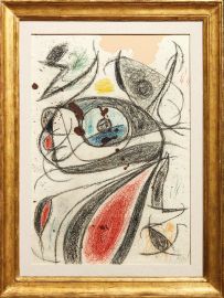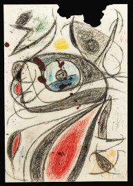 Joan Miró’s surrealistic language came to its maturity and was recognised in Europe and in the U.S. in the 1940s, with the series entitled Constellations, in which the human figure, nature, the cosmos and the animal world preside at the emergence of an oneiric alphabet. Dense nuclei of forms, outflowing from meditation on archetypal subjects, coaxed by the artist to undergo the most diverse transformations, form the centres of his creations. A kaleidoscopic metamorphosis ties together the elements belonging to these diverse levels, or stages, of being, to which the artist gives faces and figures, following and meditating on his own impulses. These phantasmagories are influenced by the fascinating prehistoric Altamira cave paintings, which, when viewed by Miró must have strengthened his resolution to cultivate within himself and in his works a growth and proliferation of primitive signs adequate to confront that incredibly ancient force – the origin – to which every single one of his images refers. Woman, therefore, is the central theme: woman is fertility, the sexual impulse, reproductive organ, earth, matrix. The bird is the element air, a trajectory in movement, energy, the phallus, desire, violence, eruption and contact with the heavens. To cite just a few of this two-sided subject in the works of the Catalan artist, let us recall Woman Encircled by the Flight of a Bird (1941) or Women and Bird in the Moonlight (1949), both oils on canvas (London, Tate) from the series Women and Birds; Woman and Bird (1964), oil on canvas, in Saint- Paul-de-Vence at the Fondation Marguerite et Aimé Maeght; and, finally, the monumental sculpture entitled Woman and Bird, in concrete and ceramic, constructed in collaboration with J. L. Artigas in 1982, in Barcelona’s Parc de Joan Miró, which would seem belong to the same formal family as our work, however singular the two expressions may be. In the large monumental work, about twenty-two metres in height, the erect body of the sculpture with its evident phallic references is split by a vulva-shaped hollow. The sculpture was born as a gigantic fictile creature, as the flowering of an aberrant vascular-ceramic project, conceivable only thanks to Miró’s decades of experimentation with the medium. In our painting, we find the same ovoid and rounded forms which, in the soaring Barcelona sculpture, rise to touch the sky with a crescent moon. Our Femme, oiseaux is, apparently, a plane projection of that world of gestating globular forms in which hypnotic eyes open on an oblong red form similar, again, to the vulva. In an interview, the artist described how he would have cultivated the flowering of his visions: «I think of my studio as a vegetable garden… The leaves have to be cut so the vegetables can grow. At a certain moment, you must prune. I work like a gardener or a wine grower. Everything takes time. My vocabulary of forms, for example, did not come to me all at once. It formulated itself almost in spite of me. Things follow their natural course. They grow, they ripen. You have to graft. You have to water…». And he acknowledged that certain subjects, like woman, like the bird, would never abandon him, but would return; and that he would accumulate them, as though they were seeds, some of which would germinate, others which would not. (Miró, 1959)