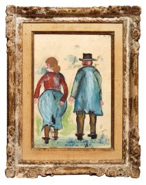 The sheet is part of a series of studies for Les Ballets Russes of the Russian producer Sergej Diaghilev, whose company was founded in 1911. Furthermore, it would seem that Utrillo’s frequent use of bounteous female figures in his works derives from a specific episode in his life involving just such a woman. One day, Suzanne Valadon, the painter’s mother and an artist herself, hired a full-figured model by the name of Gaby who, besides posing for Valadon, also lent a hand around the home. It was not long before Utrillo’s mother attempted to arrange a marriage between Gaby and her son who, following repeated stints in clinics for treatment of his alcoholism, had been committed to the Villejuif psychiatric hospital. Gaby saw how dangerous such a marriage would have been, and fled. In remembrance of this flight, from 1921 onward Utrillo began populating his Paris streets with views of women with disproportionately wide hips, often dressed in red, walking away from the viewer, eternally fleeing from any approach by the artist.