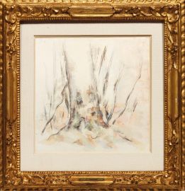 Impatient with busy, chaotic Paris, Paul Cézanne often felt the need to return to the south of France to lose himself in the woodlands of his region of origin, Provence, and to spend days in solitary devotion to nature, attempting to capture her many and changing forms and transitions of light and colour. Between 1881 and 1888, he alternated these Provençal escapes with frequent excursions outside of Paris, to the forest of Fontainebleau, the Val-d’Oise, La Roche-Guyon, in the company of such friends and colleagues as Auguste Renoir. During these sojourns in northern France, the brilliant light typical of his southern scenes was attenuated, leaving space on his palette for darker and more verdant colours. As time went by, watercolour became more preponderant in Cézanne’s production and in those years represented the last expression of his mature art. Differently from oils, the technique offered the artist more varied and valid solutions for realising his careful renderings of the fleeting effects of translucence he saw in nature. When he described Cézanne’s personal working method, Émile Bernard clarified how the painter’s use of watercolour was entirely different from the usual practices and of an extreme complexity, since it was based on a principle of harmonious cooperation among the colours, laid on one over the next in successive touches while still wet in an attempt to recreate the volumetric sense of the forms of nature (É. Bernard, in J. Rewald, Paul Cézanne: The Watercolours, A Catalogue Raisonné. London 1983, p. 37). This method is apparent in our work, in which the French master turns his eye to the mosses and the typical spontaneous vegetation of the forest floor grown up around the base of a beech tree and skilfully translates them into a delicate balance poised between line and whispers of soft colour. In his watercolours of this period, Cézanne revolutionised the spatial structure of the composition, focusing solely on the two-dimensional rendering of the natural motif; he also left large portions of the paper support untouched, as though to amplify the atmosphere of rarefied and crystalline quiet.