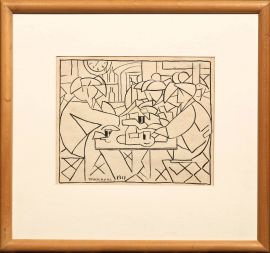 Rafael Barradas left Montevideo in 1913 for Europe, where he came into contact with the major new currents in art; that same year in Milan, he assimilated the principles of Italian Futurism which he took, together with Simultaneism and Cubism, as the foundation of Vibracionismo, the avant-garde pictorial movement he theorised in Spain between 1917 and 1920, with his compatriot Joaquín Torres García. The interest of the two Uruguayan artists centred on the frenetic movement of the modern big city and its actors; they analysed it in numerous fragments of simultaneous images intended to generate an illusion of movement and “vibration” from the outside toward the interior of the scene. In this drawing, dated 1917, Barradas’ new theories unite in a sound and well-reasoned construct. Its figuration plays out entirely in reiterated geometric forms to multiply the sense of movement and the vertiginous progression of the composition. In particular, the two diagonals on which the heads of the patrons are constructed, as though linked the one to the next, accompany the eye of the observer along a perspective fast track to the back of the room, lending greatly increased depth to the scene.