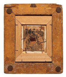 The contemporaries of Giotto’s master Cimabue recalled him dressed in white and Andrea di Bonaiuto, in the Cappellone degli Spagnoli or Chapter Room of Santa Maria Novella in Florence portrayed him thus, wearing a short white cloak, the hood over his head, a shirt, hose and shoes, all just as white. Raffaello Sorbi copied this iconography in his Giotto e Cimabue (1919), for which this small panel is a study. The Florentine painter Sorbi worked from the latter half of the 1800s through the 1920s; his work is always strongly characterised by references to 18th-century, medieval, and even Pompeian art. Remembered as one of the top students at the Scuola Libera del Nudo – in truth, a school of life drawing of all sorts – inaugurated in Florence in 1859 by Ticinese painter Antonio Ciseri as a complement to the academic courses, young Sorbi distinguished himself early on and won an award at the Florentine Triennale contest of 1861 with a work which, to paraphrase Telemaco Signorini, made the Florentine old guard believe that the miracles of 15th-century art had returned (T. Signorini, “Come l’assenza della critica isterilisca gl’ingegni. Dei quadri del signor Raffaello Sorbi” in Gazzettino delle Arti del Disegno, yr. I, no. 8, 9 March 1867). Sorbi, in fact, demonstrated that he possessed great ingenuity and a considerable pictorial ability which immediately aroused the interest of numerous admirers. In the small panel, a full-length Cimabue approaches the stone on which the young Giotto drew the famed O. With his left hand resting at his waist and the right holding the cord to which, in the canvas, the horse is tethered, he bends his head toward the ground. The same gesture is repeated in the canvas, in which, however, the young Giotto is portrayed at Cimabue’s feet, his hands resting on the stone outcrop, surrounded by his sheep.