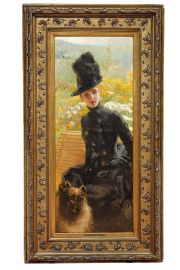 After studying in Florence and spending time in Naples, Corcos went to Paris. It was 1880, he was twenty-one years old and had a career to build. He stayed in Paris for six years, associating with the large group of Italian artists who worked with the prestigious art dealership, Goupil & Cie, and he, too signed a fifteen-year contract with them. One of his fellow countrymen was Giuseppe De Nittis, a talented painter from Barletta who specialized in portraits of Parisian women. Corcos considered him a “great painter” as we learn from the diary entry he wrote after his colleague’s funeral. De Nittis died suddenly at the age of thirty-eight, that is in 1884, one year before Corcos painted the Lady with a Dog. His fame and reputation on the international market had led to many fakes and incorrect attributions even prior to his death. For commercial reasons, the signature on this painting by Corcos was changed, and the date (1885) deleted after it was sold at Christie’s, London in 1975, so that it became a work by De Nittis. In fact, Enrico Piceni included it in the second volume of the general catalogue of De Nittis’ paintings published in 1982; and it also appeared in the general catalogue (n.799) by P. Dini and G.L. Marini, published by Allemandi in 1990. However, when the painting was displayed in the 2011 Paris exhibition, Giuseppe De Nittis, la modernité elegante, the doubts concerning the attribution to De Nittis expressed by several experts were confirmed. Two years later, the painting was shown in another De Nittis exhibition (Padua, Palazzo Zabarella), but this time, finally attributed to Corcos.