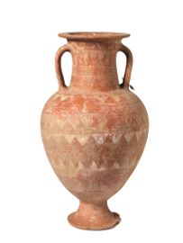 Anfora in ceramica d’impasto rosso, con orlo a tesa appiattito, collo cilindrico, corpo ovoidale, piede a tromba, anse impostate sulla spalla e poco sotto l’orlo. La decorazione, che interessa tutto il corpo, è realizzata in vernice sovraddipinta di colore bianco e si dispone su più registri orizzontali, con triangoli variamente campiti da reticoli, gruppi di linee e motivi a cani correnti. H. 44,5 cm; diam. orlo 17 cm.