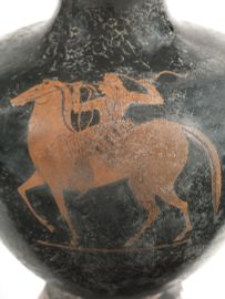 Kalpis con corpo ovoidale compresso, orlo ingrossato appiattito superiormente, collo a profilo concavo, piede modanato. Due anse orizzontali sul punto di massima espansione del vaso e un’ansa verticale sul collo. La decorazione figurata, posta al centro del vaso, consiste in una figura di amazzone a cavallo a figure rosse. La guerriera, vestita in abito scitico, tiene le redini con la destra, mentre con la sinistra solleva un arco. Sul fianco sinistro dell’amazzone pende una faretra. Linee paonazze definiscono i dettagli: la veste della figura, la coda del cavallo e la corda dell’arco. Una linea paonazza sotto la linea di terra e un’altra tra corpo e piede. Il resto del corpo, eccetto l’orlo e l’interno delle anse orizzontali, è coperto da