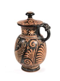 Olpe con corpo ovoidale, orlo svasato, collo a profilo concavo, ansa a doppio bastoncello con nodo nel suo tratto superiore e con placchetta all’inserzione nell’orlo e piede a echino modanato. Coperchio troncoconico con pomello cilindrico a presa discoidale. La decorazione a figure rosse presenta una testa femminile di figura alata. La donna ha i capelli raccolti in un sakkos riccamente decorato e presenta un diadema, un lungo orecchino pendente e una collana; mentre sul retro è presente un motivo a palmetta. Alla basse corre un motivo a onde, mentre sul collo un motivo a fiori marginato inferiormente da un decoro a perline. Il coperchio è decorato da un’altra testa di donna, acconciata questa volta con un kekryphalos, tra palmette e girali vegetali. H. 29,8 cm; diam. orlo 13 cm.