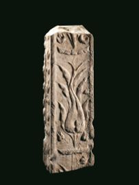 Frammento di pilastro a sezione quadrangolare in marmo bianco a grana fine, decorato a rilievo su tutti i quattro lati. La decorazione presenta sui lati brevi una corona di foglie d’alloro; sui lati principali compaiono dei motivi floreali con racemi e piccoli frutti. H. 48 cm; largh. 15,7 cm