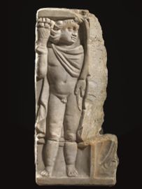 Frammento di lato corto con tratto di fronte a esso contiguo di sarcofago in pietra calcarea compatta. Della fronte originariamente strigilata si conserva solo una figura di fanciullo ammantato. Il putto solleva in alto con la mano destra un piccolo cestino colmo di frutta. Un altro cesto di frutta compare anche sul fianco. La superficie del cesto, a basso rilievo, è lavorata in mondo da rendere vividamente la struttura in vimini del contenitore. AI lati del grande contenitore si vedono numerosi altri frutti, allusivo riferimento all’abbondanza. Dim. 60x57x22 cm
