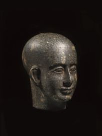 Testa maschile in granodiorite. Raffigura un uomo totalmente rasato, con cranio ovoidale, fronte ampia, arcate sopracciliari accentuate da un passaggio di piani sfumato, occhi a mandorla con indicazione delle palpebre rese da elementi a rilievo. Il naso è diritto, le orecchie, sporgenti, sono rese in modo anatomicamente coerente. Il modellato della testa, finemente polita, è accurato, con un’indicazione precisa degli zigomi e della struttura delle tempie; lievemente compresse. Sul retro della testa è conservato il tratto superiore del pilastro di sostegno della statua. H. 19 cm