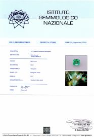 impreziosito sulla sommità da uno smeraldo colombiano taglio ottagonale di ct 9.97, circondato da una corolla di diamanti taglio brillante per ct 2 circa, mis. 17, g 7. Corredato di Certificato gemmologico I.G.N del 25/09/2019 attestante le caratteristiche.