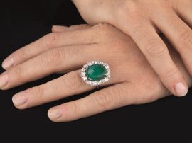impreziosito sulla sommità da uno smeraldo taglio cabochon di ct 11 circa, circondato da una corolla di diamanti taglio antico per ct 1.10 circa, mis. 9, g 7