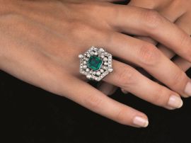 impreziosito al centro da uno smeraldo taglio ottagonale di ct 2.40 circa, circondato da diamanti taglio brillante per ct 0.70 circa, mis. 16, g 11
