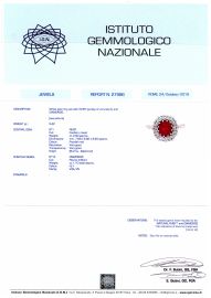 impreziosito al centro da un rubino taglio cuscino di ct 2, circondato da una corolla di diamanti taglio brillante per ct 1.10 circa, colore H-I, purezza Vvs-Vs, mis. 19, g 5. Corredato di certificato gemmologico I.G.N del 24/10/2019 attestante l'origine geografica e l'assenza di trattamenti termici.