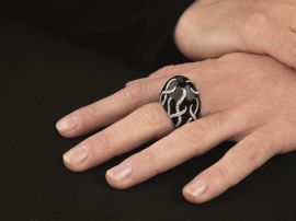 di forma bombata, decorato in smalto nero e fiamme in oro bianco impreziosite da diamanti taglio brillante per ct 1.30 circa, punzoni 750 e del fabbricante, mis. 15, g 21