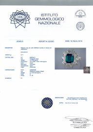 al centro uno smeraldo taglio ottagonale di ct 2.30 di origine colombiana, circondato da una corolla di diamanti taglio a scudo e navette per ct 4.20, colore G, purezza IF-Vs, punzone PT, mis. 11, g 9