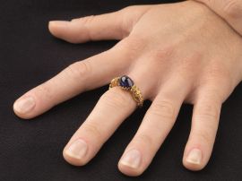 impreziosito sulla sommità da uno zaffiro taglio cabochon di ct 4.70 circa e ai lati da volti di figure classiche sbalzate, mis. 16, g 8
