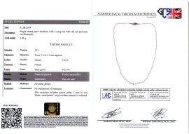 ad un filo di perle naturali digradanti da mm 5,3 a mm 1,4, con fermatura in oro giallo impreziosita da diamanti taglio vecchio e rose di diamante, punzone 18Kt, lungh. cm 43, g 5. Corredata di certificato GCS del 01/08/2019 attestante le caratteristiche.