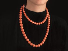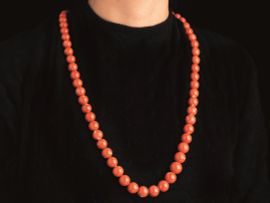 ad un filo di sfere di corallo digradanti da mm 15 a mm 10 circa, fermatura in oro giallo 18kt, lungh. cm 100, g 213